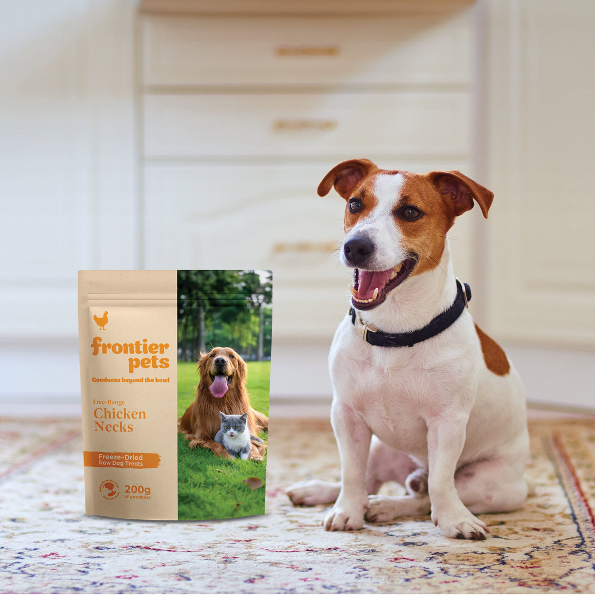 - Dental Health: Chewing raw bones or raw freeze-dried treats like our raw chicken necks naturally cleans your dog’s teeth, reducing plaque and tartar buildup. This can lead to better overall dental health and fresher breath.