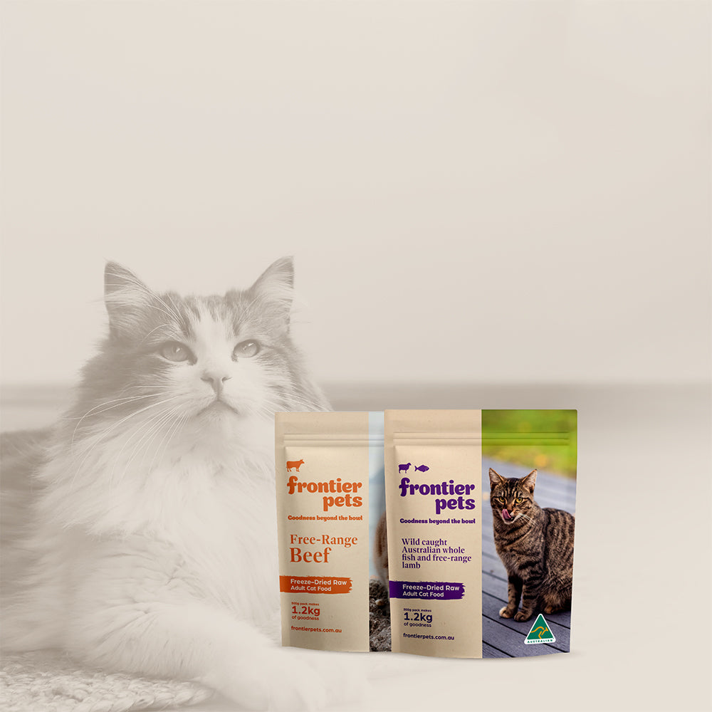 Why settle for generic food when you can keep your cats healthy with natural cat food made with ingredients that are sourced using eco-conscious farming practices? At Frontier Pets, all of our pet foods online contribute to our cause of supporting Australian farmers.