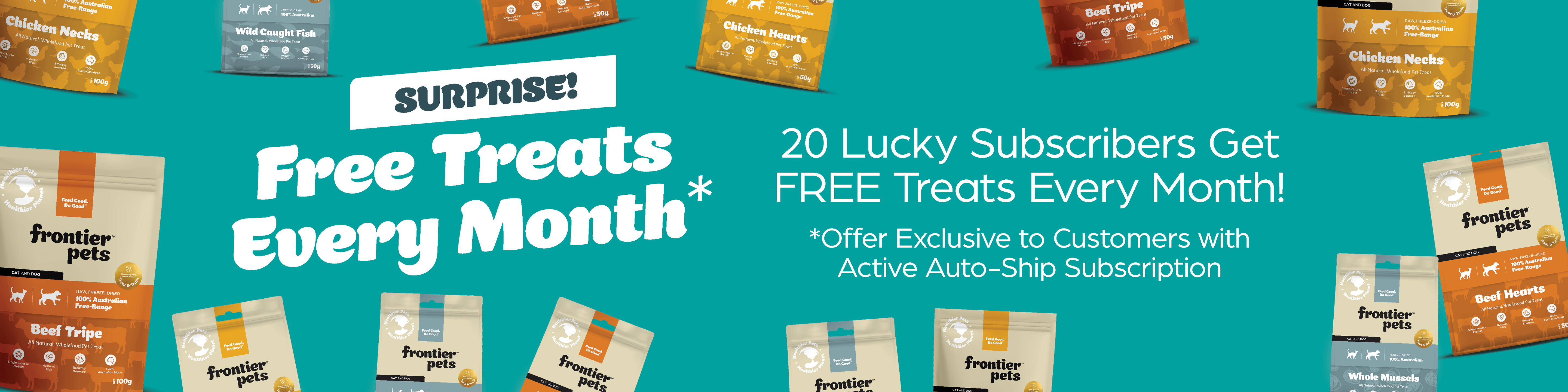 Surprise! 🎉 Every month, 20 Frontier Pets subscribers will find a little extra love tucked inside their regular delivery – free treats for your beloved pet.
