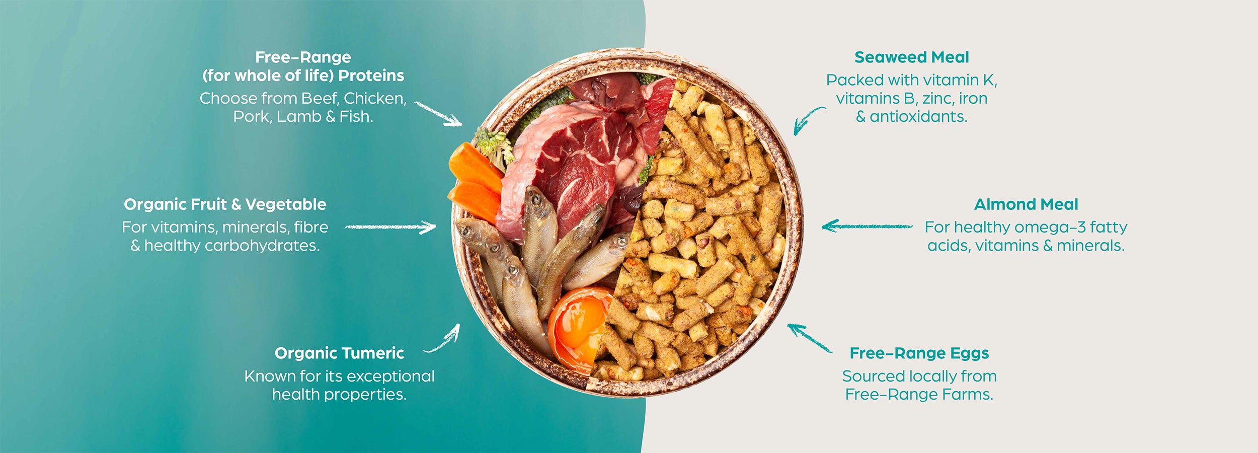 - High quality, human-grade ingredients sourced from sustainably-sourced, seasonal and free-range producers.