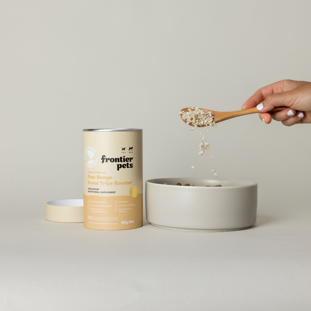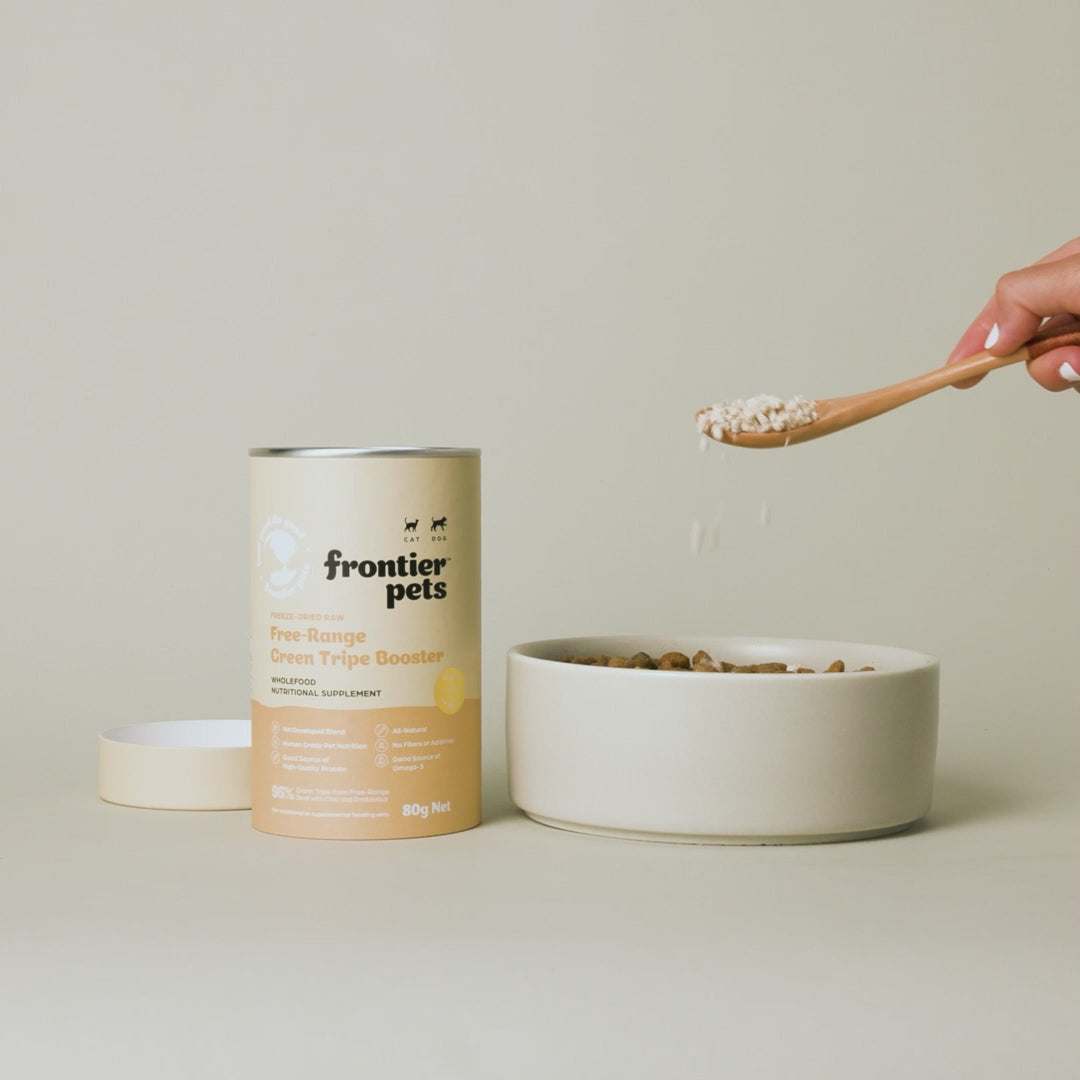 The Free-Range Green Tripe Booster is made from nutrient-rich green tripe, chia seeds, and added probiotics. This combination offers a balanced source of protein, Omega-3 fatty acids, fiber, and beneficial bacteria to support your pet's overall health.
